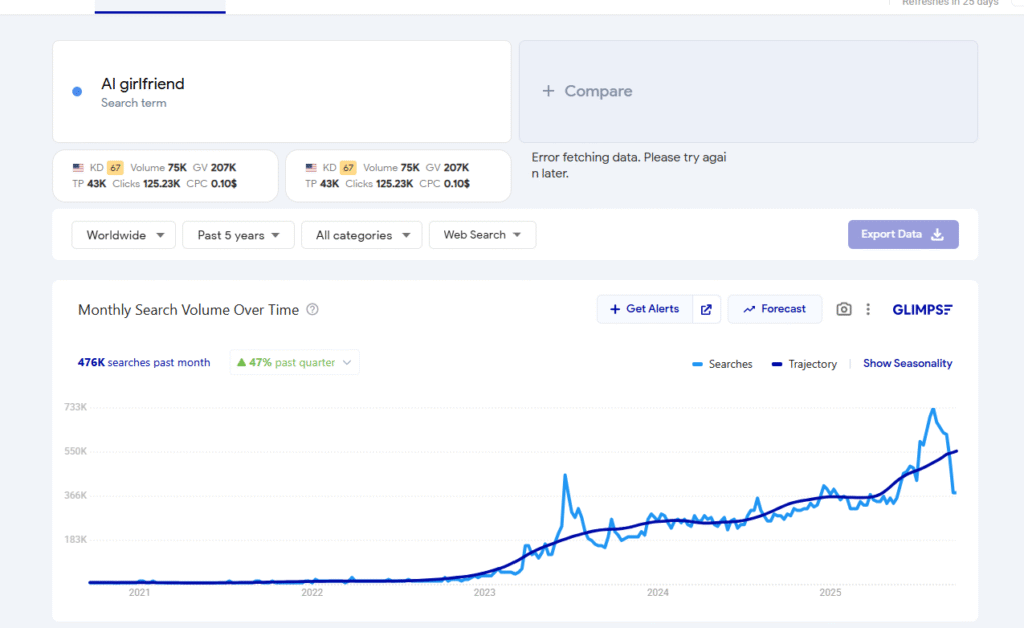 In the U.S. alone, searches for “AI companion” surged 490% over a single year. By early 2024, “AI relationship bots” generated more than 73,000 monthly searches, while annual searches for chatbot girlfriends in English surpassed 1.6 million.