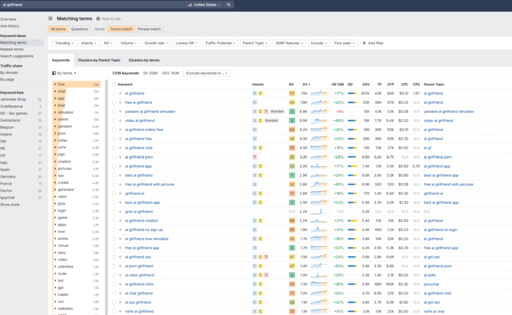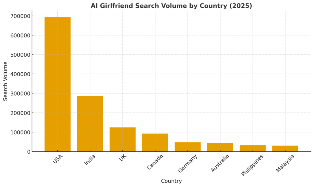 • United States: 693,600 searches for AI girlfriend–related terms.